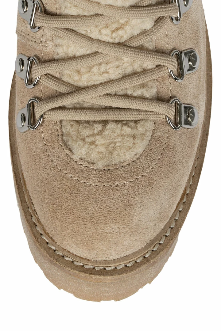 Lug-sole lace up bootie with shearling.