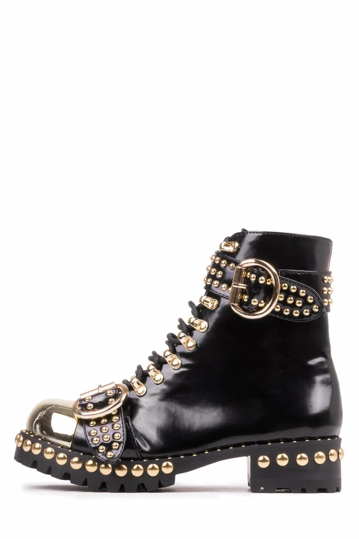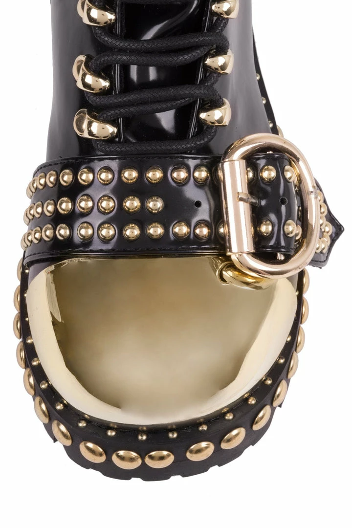 Combat boot with cap-toe and studs.
