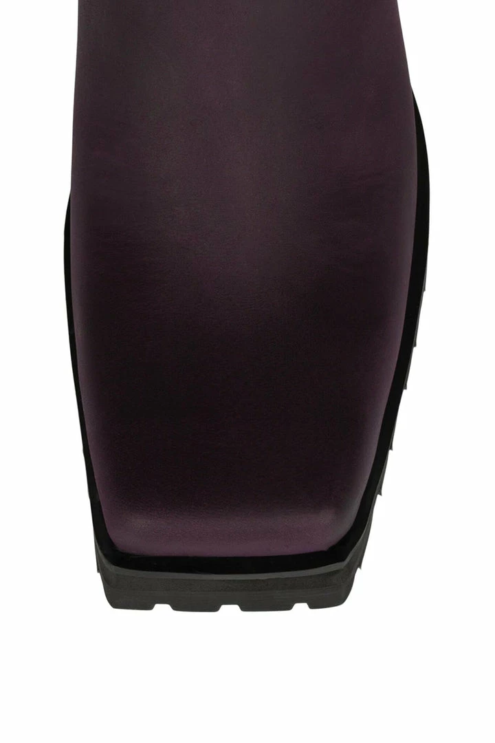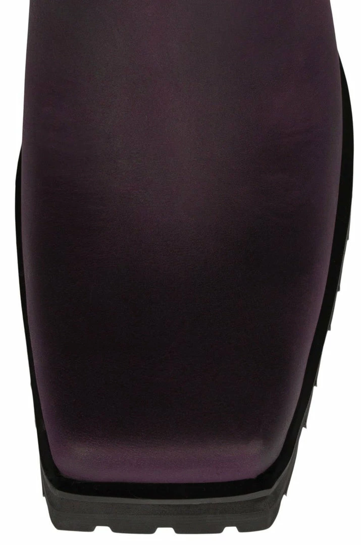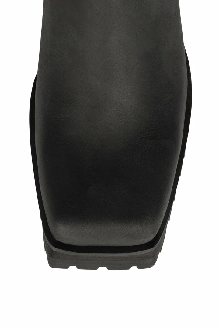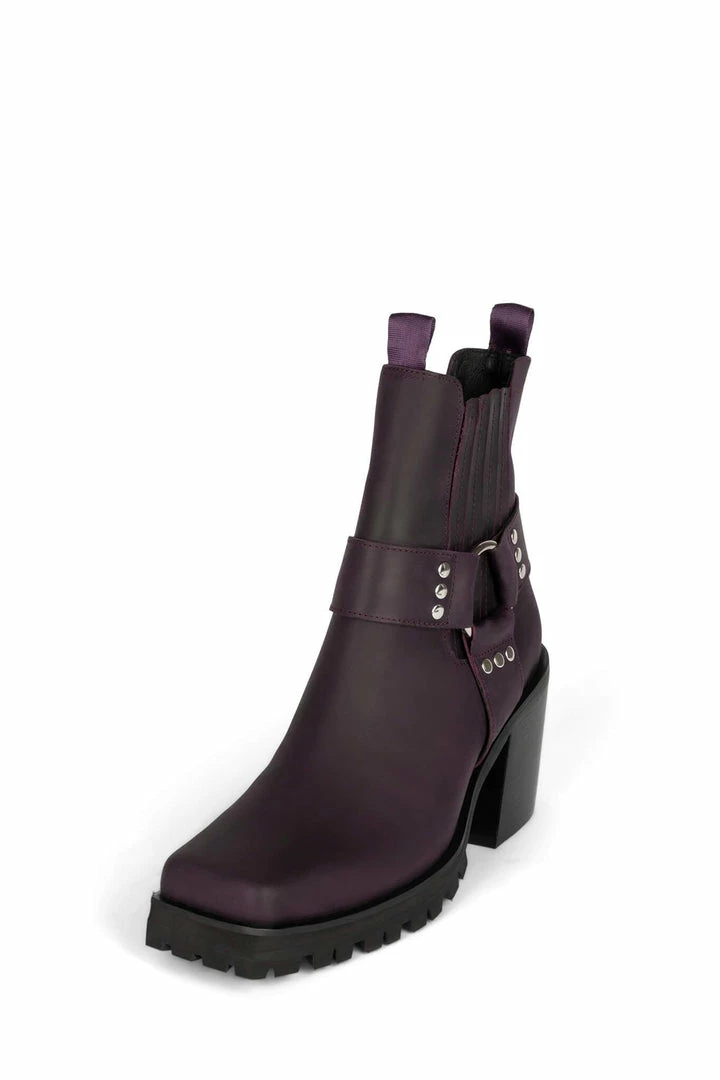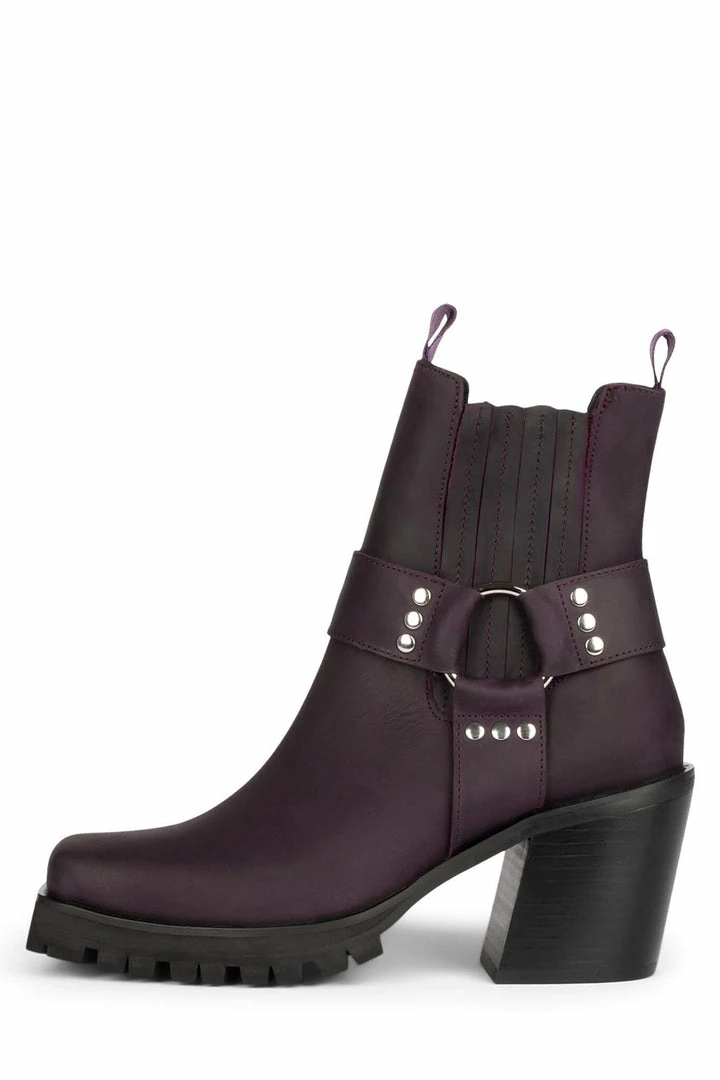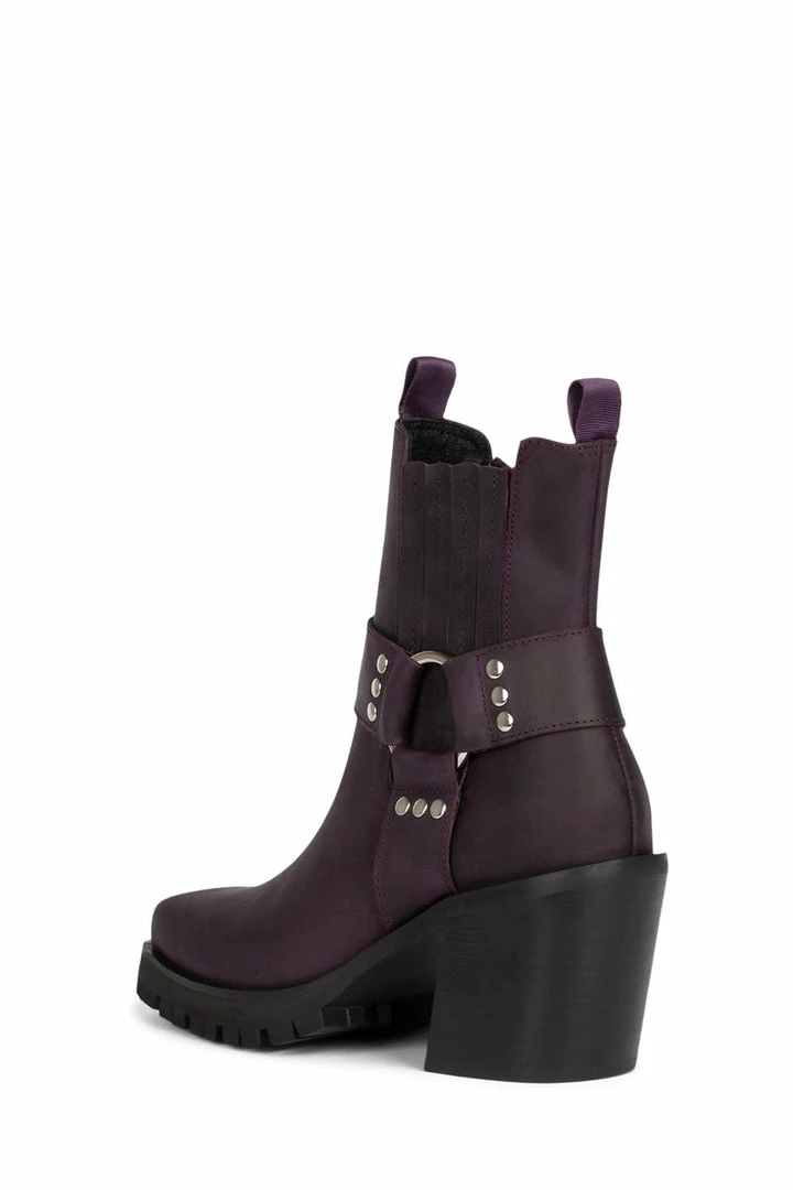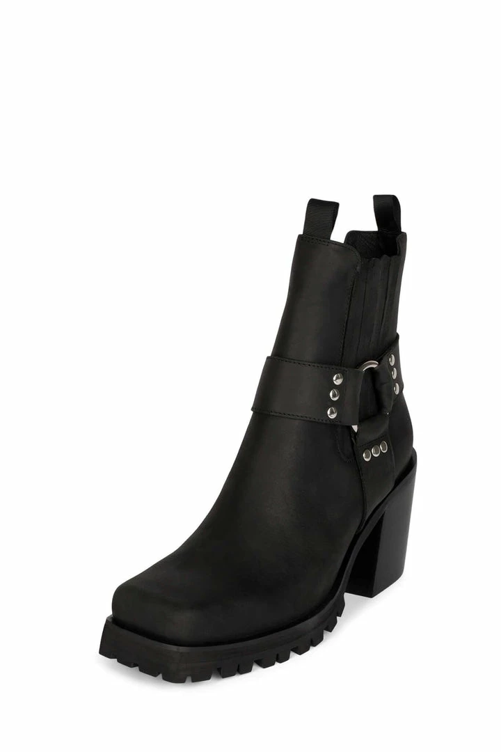 Square-toe lug sole bootie with harness.