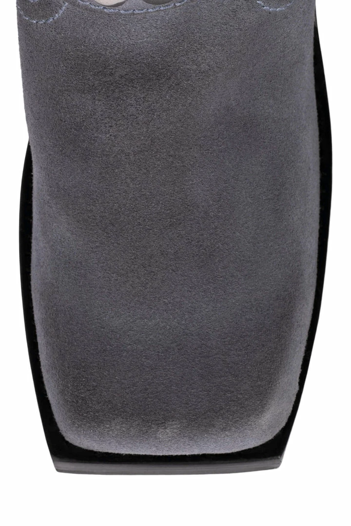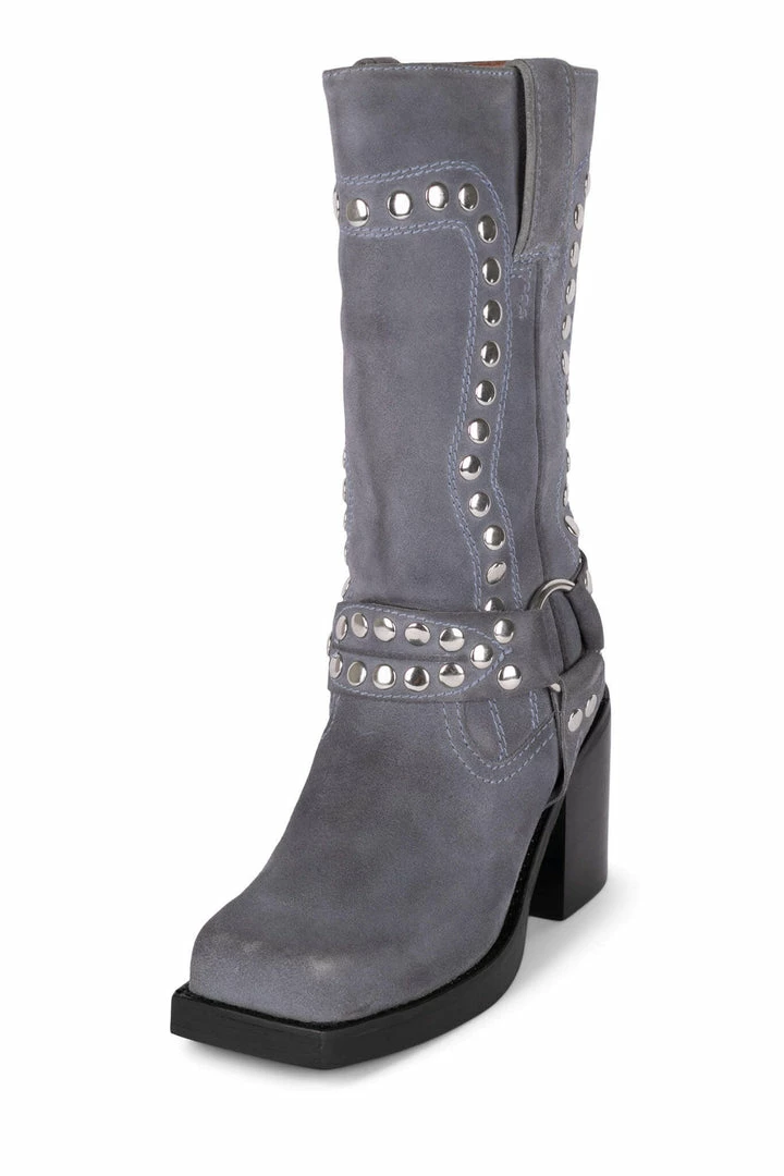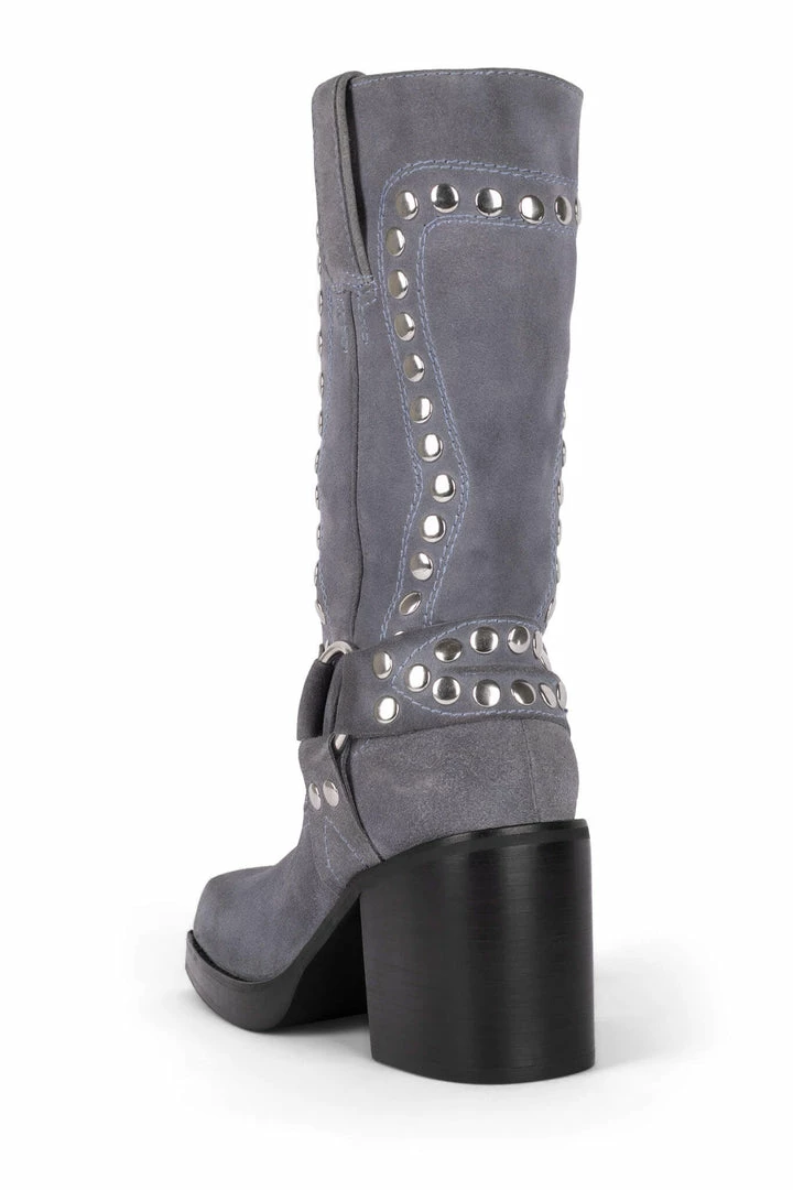 Square-toe mid-calf heeled western boot with stud detail and harness