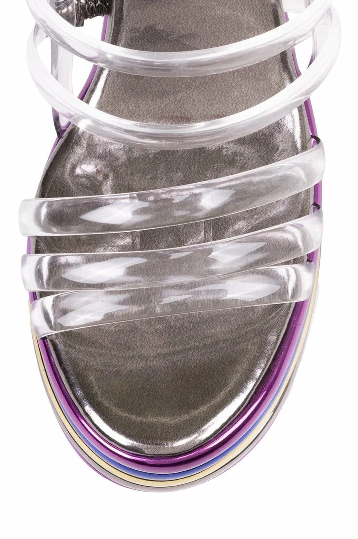 Metallic platform sandal.