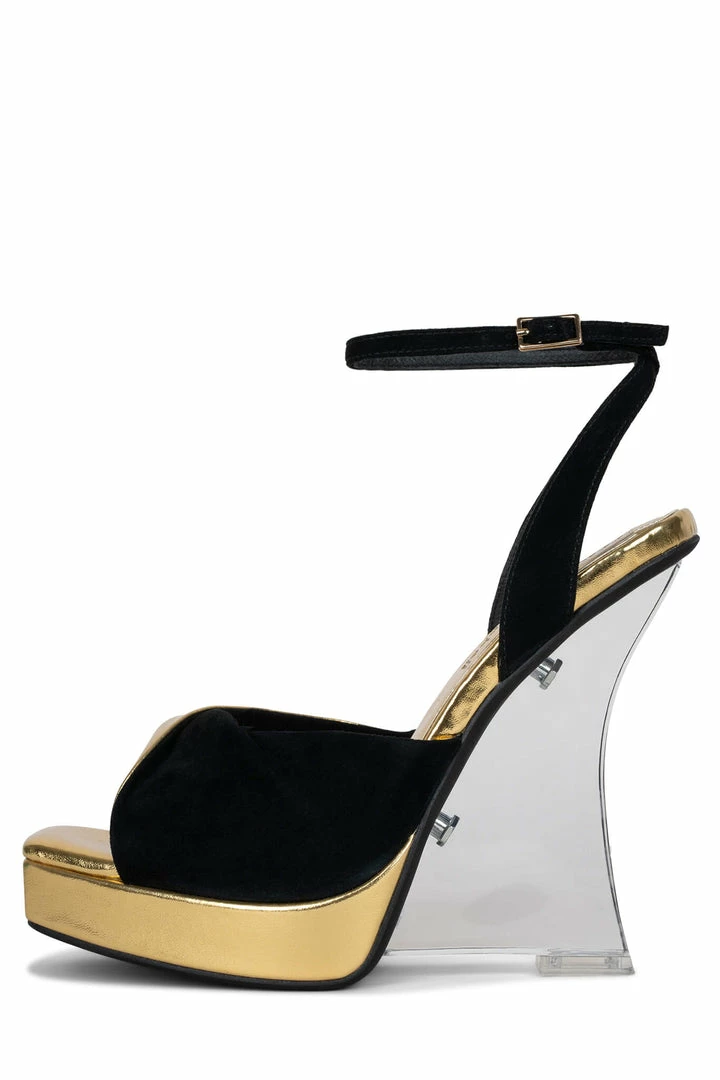 Mixed-material platform sandal with lucite wedge and ankle strap.