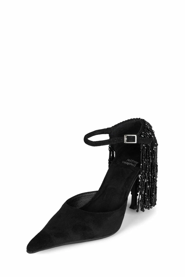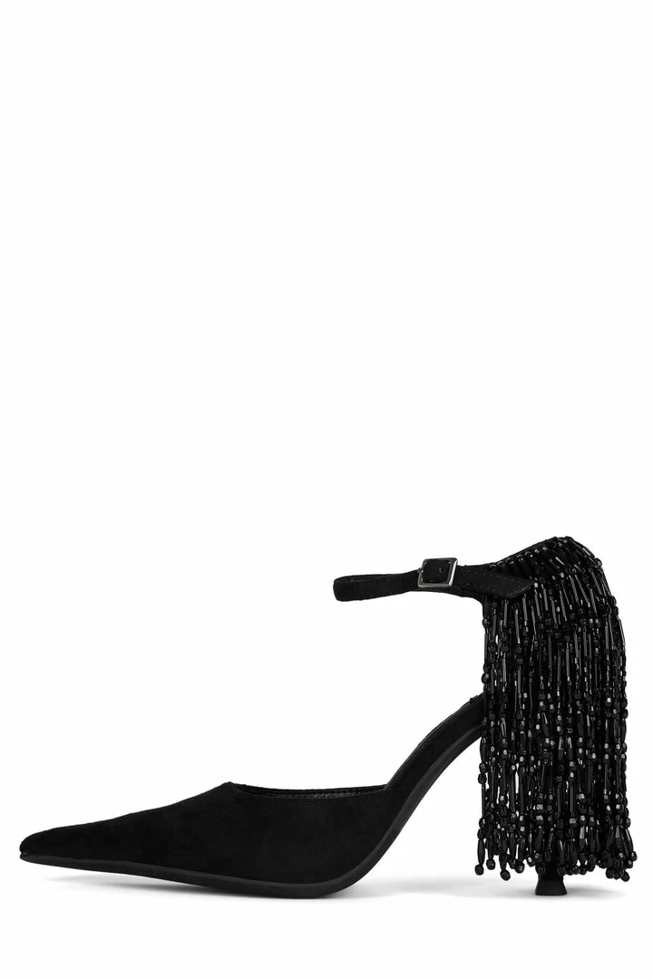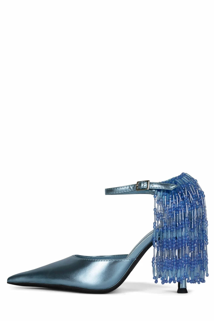 Stiletto heeled pump with ankle-strap and beaded fringe