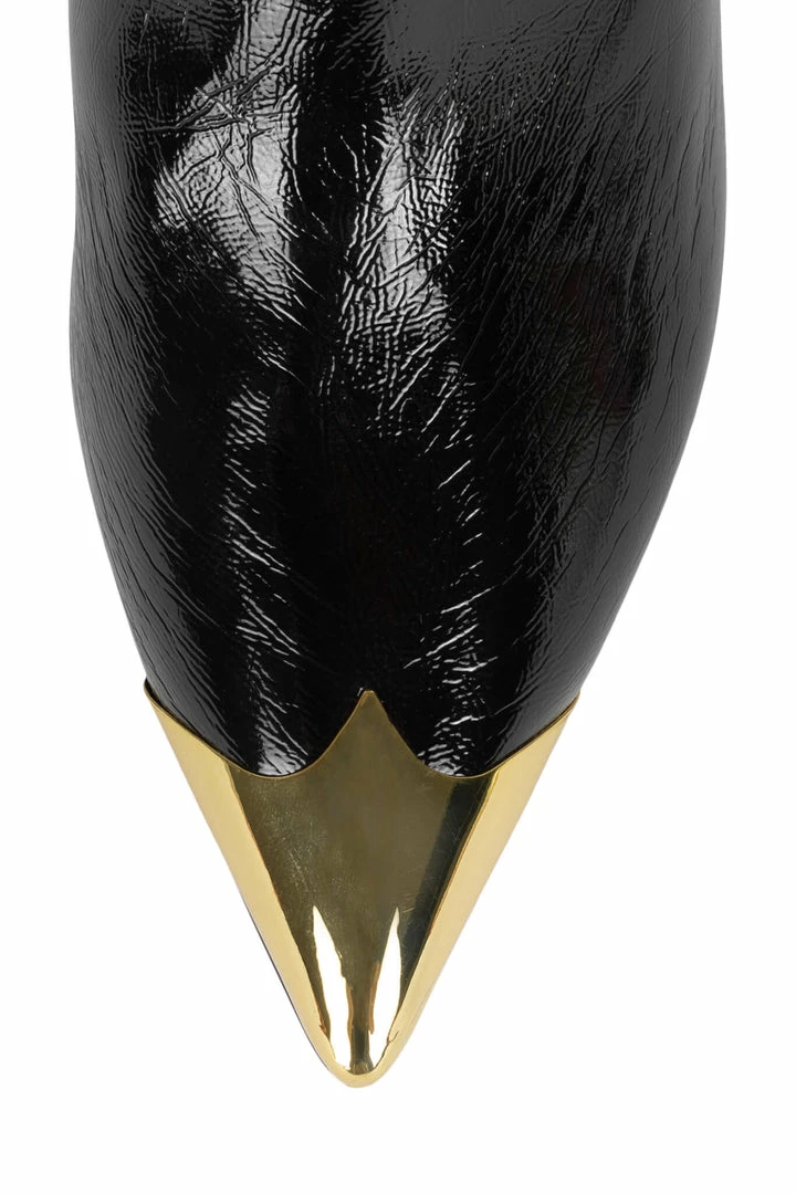 Color-block western stiletto boot with butterfly motif and mesh insert