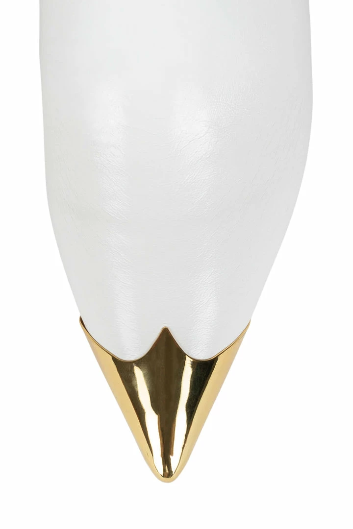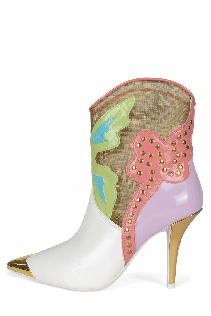 Color-block western stiletto boot with butterfly motif and mesh insert