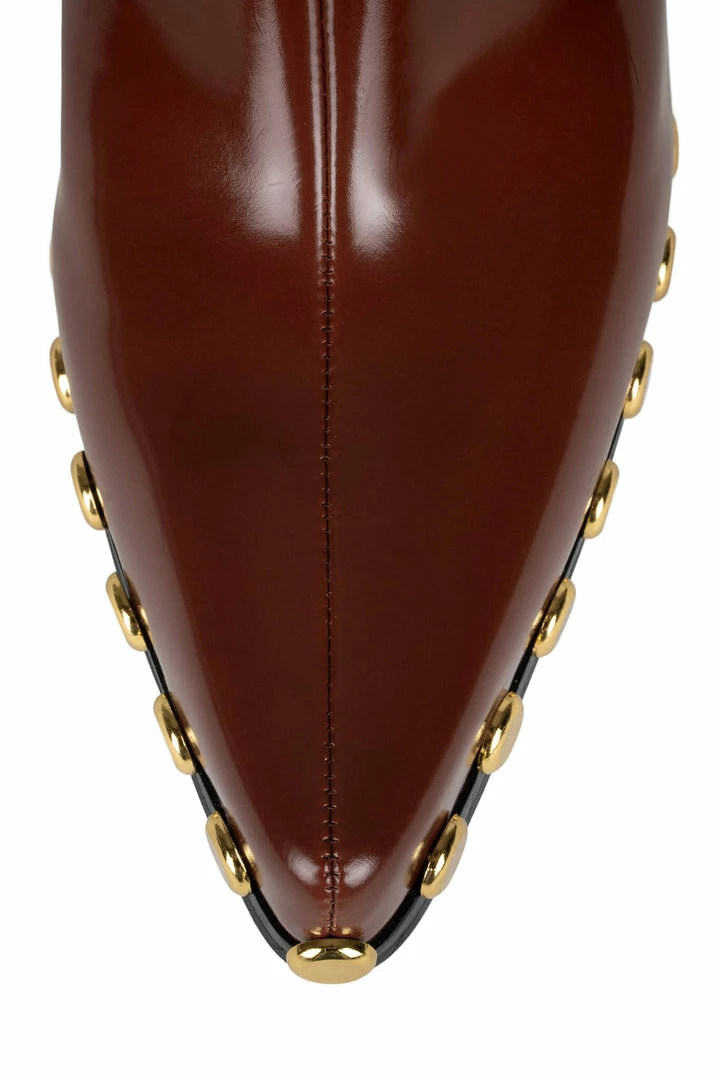Western-inspired ankle bootie with studded welt and o-ring detail