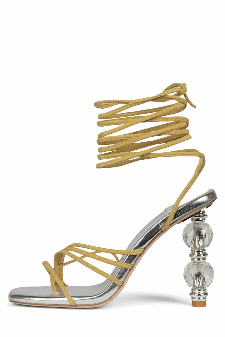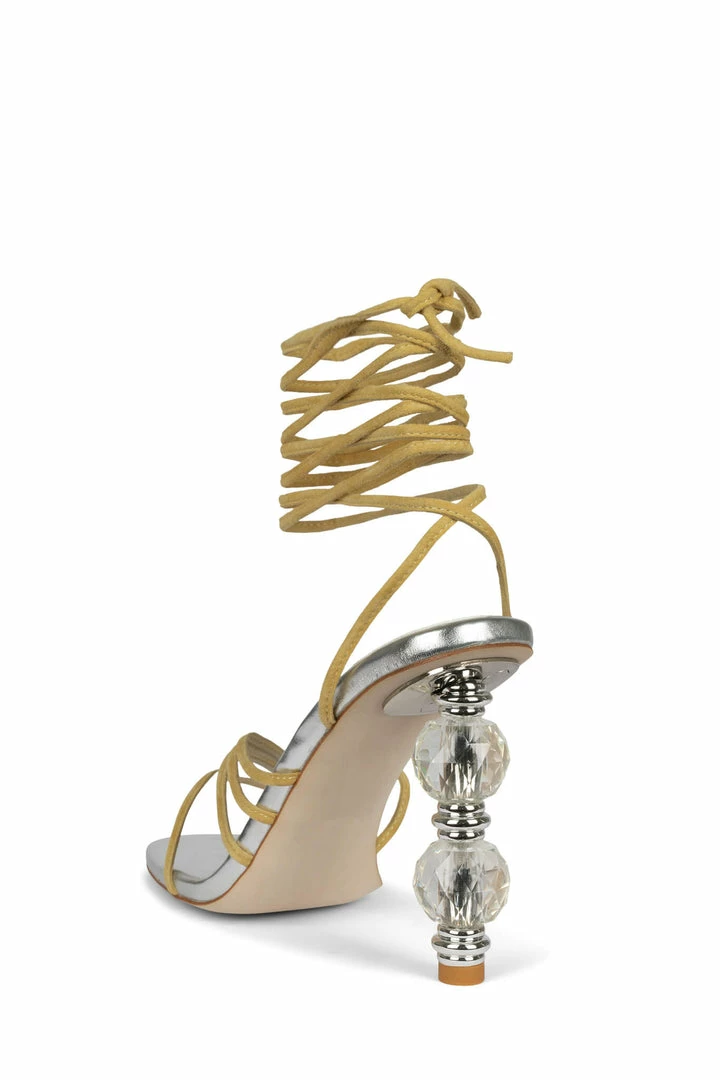 Strappy ankle-tie sandal with beaded heel.