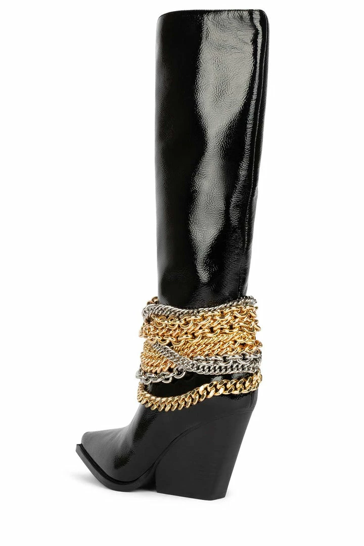 Knee-high pointed-toe wedge boot with chain detail