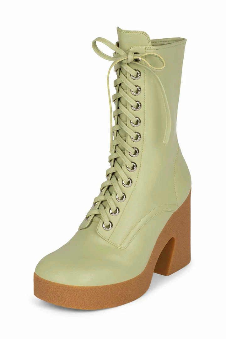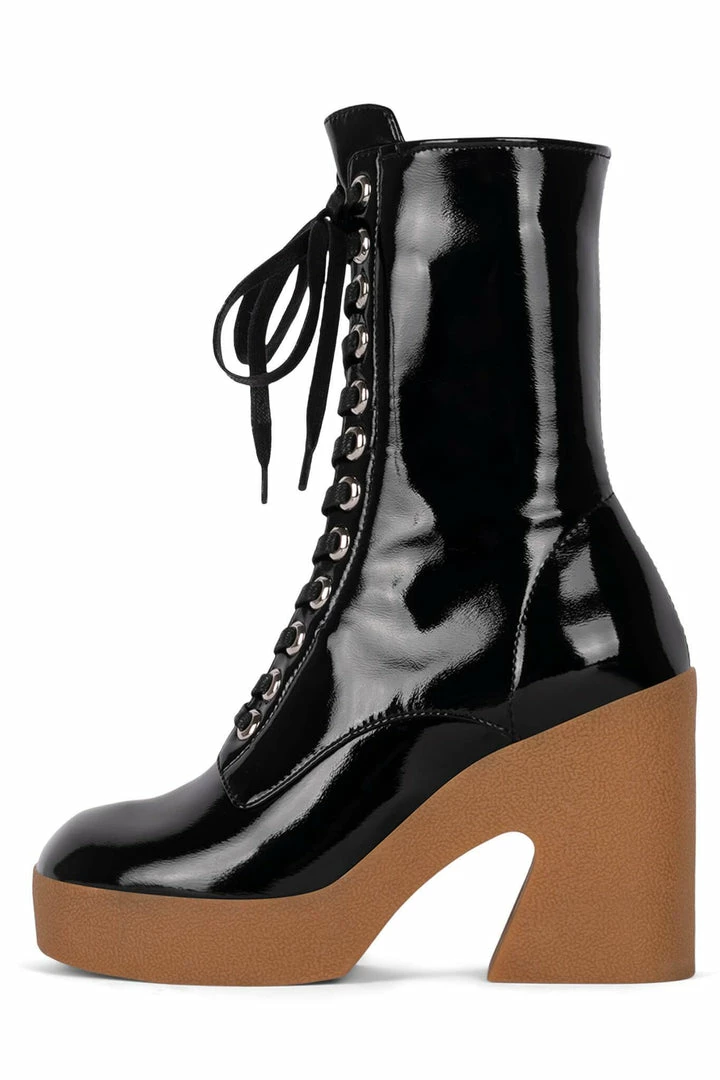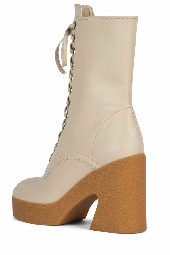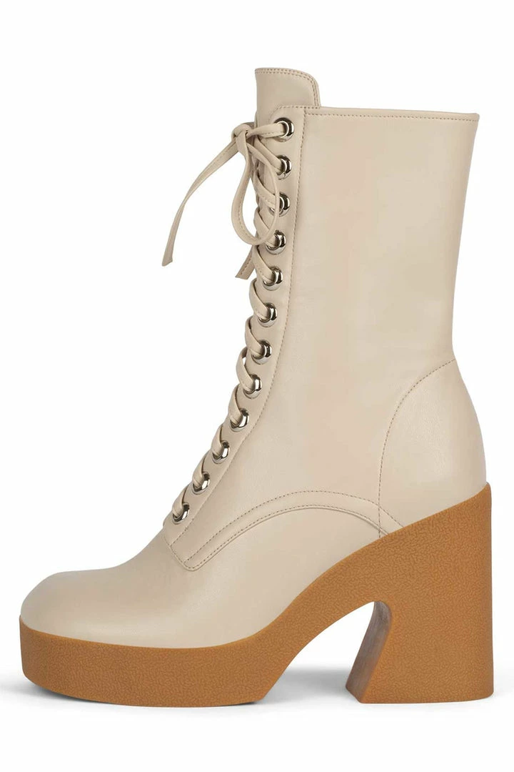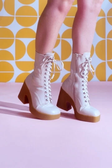 Platform mid-calf lace-up bootie with padded rubber sole.