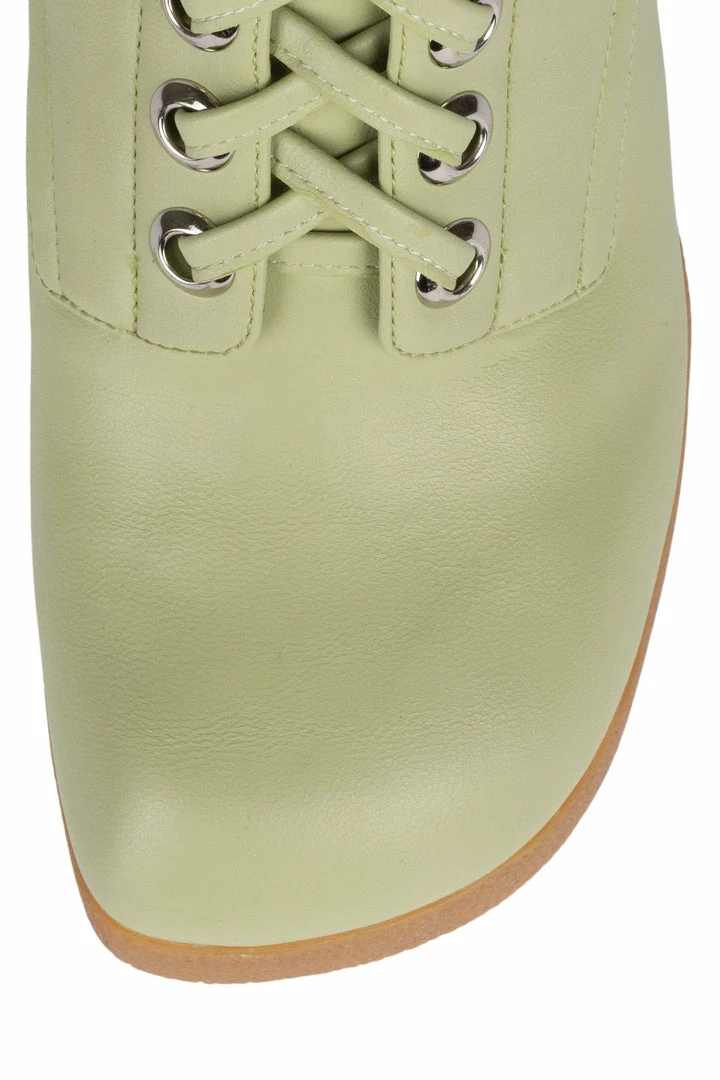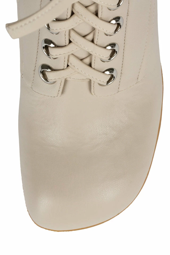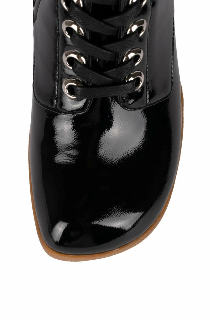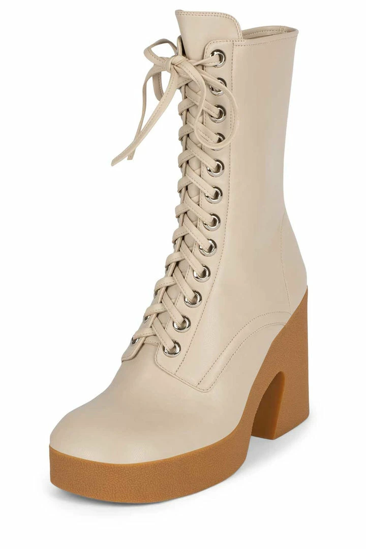 Platform mid-calf lace-up bootie with padded rubber sole.